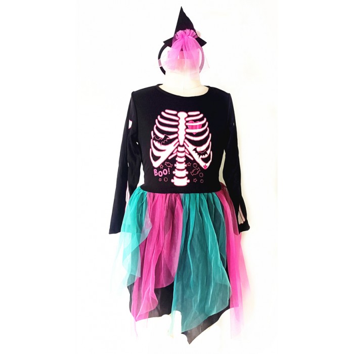 KID SIZE BLACK SKELETON PRINT, RAINBOW TUTU BOO COSTUME